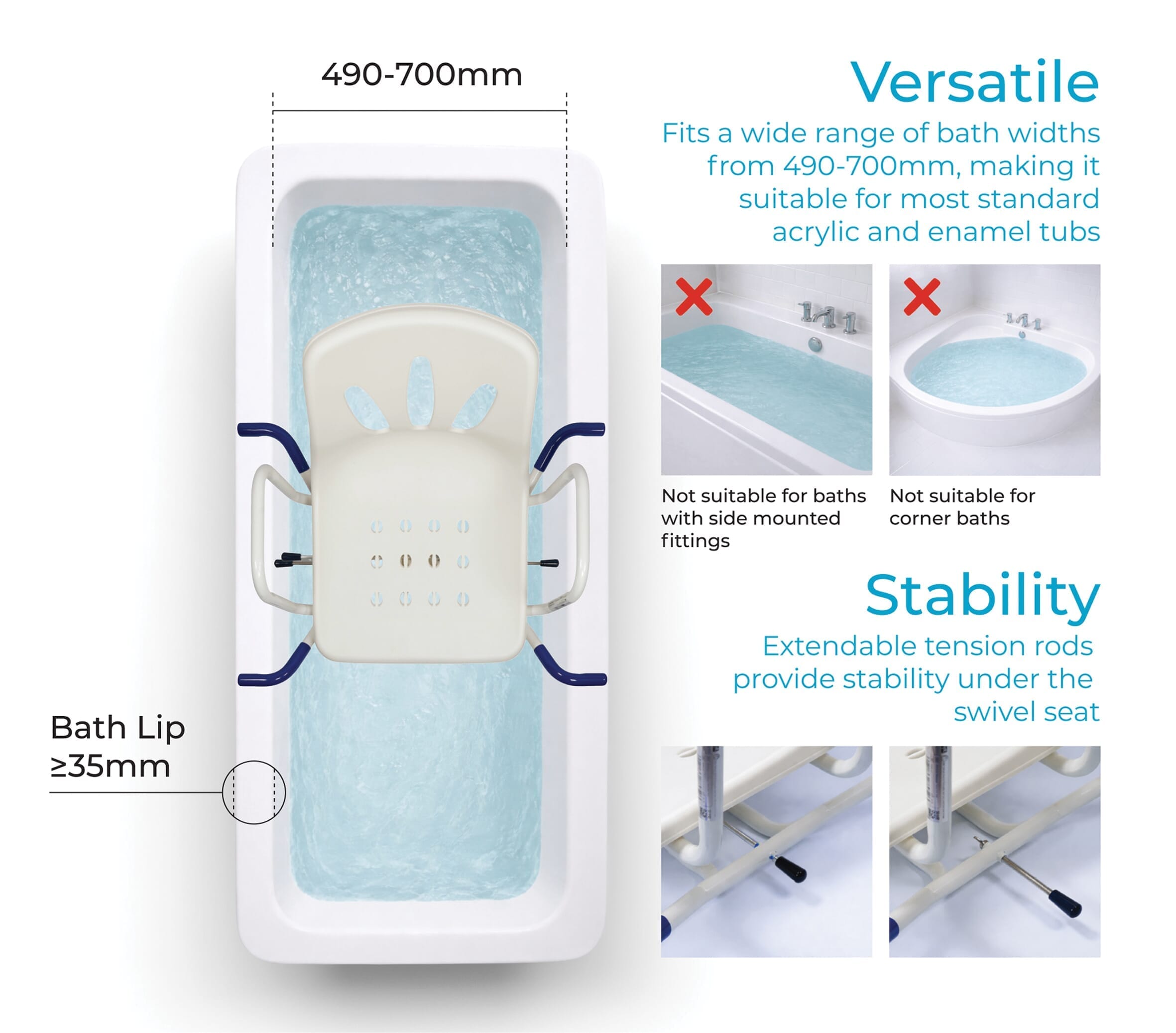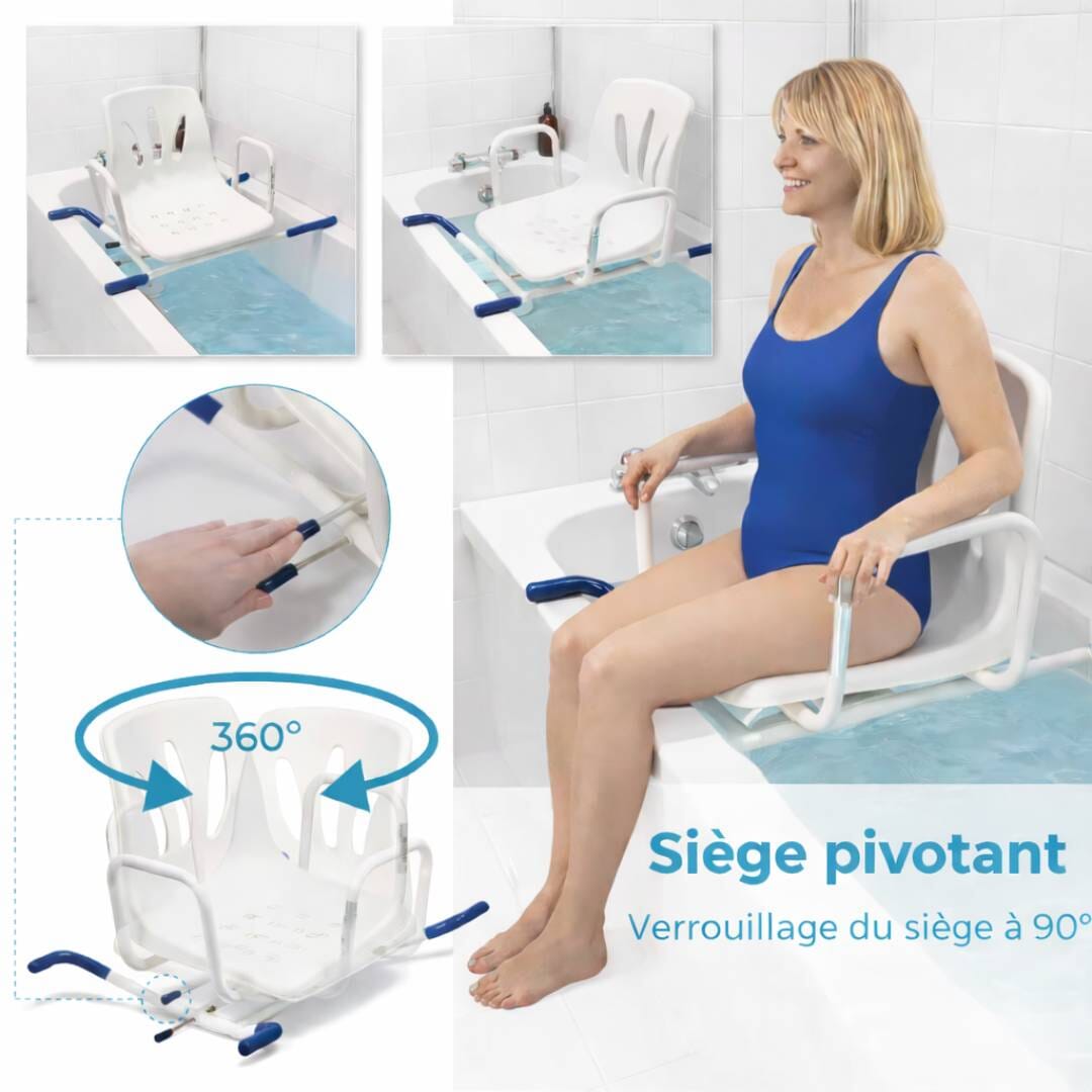 • Le siège pivotant aide les utilisateurs à entrer dans la baignoire en toute sécurité sans avoir à lever les jambes par-dessus le bord.