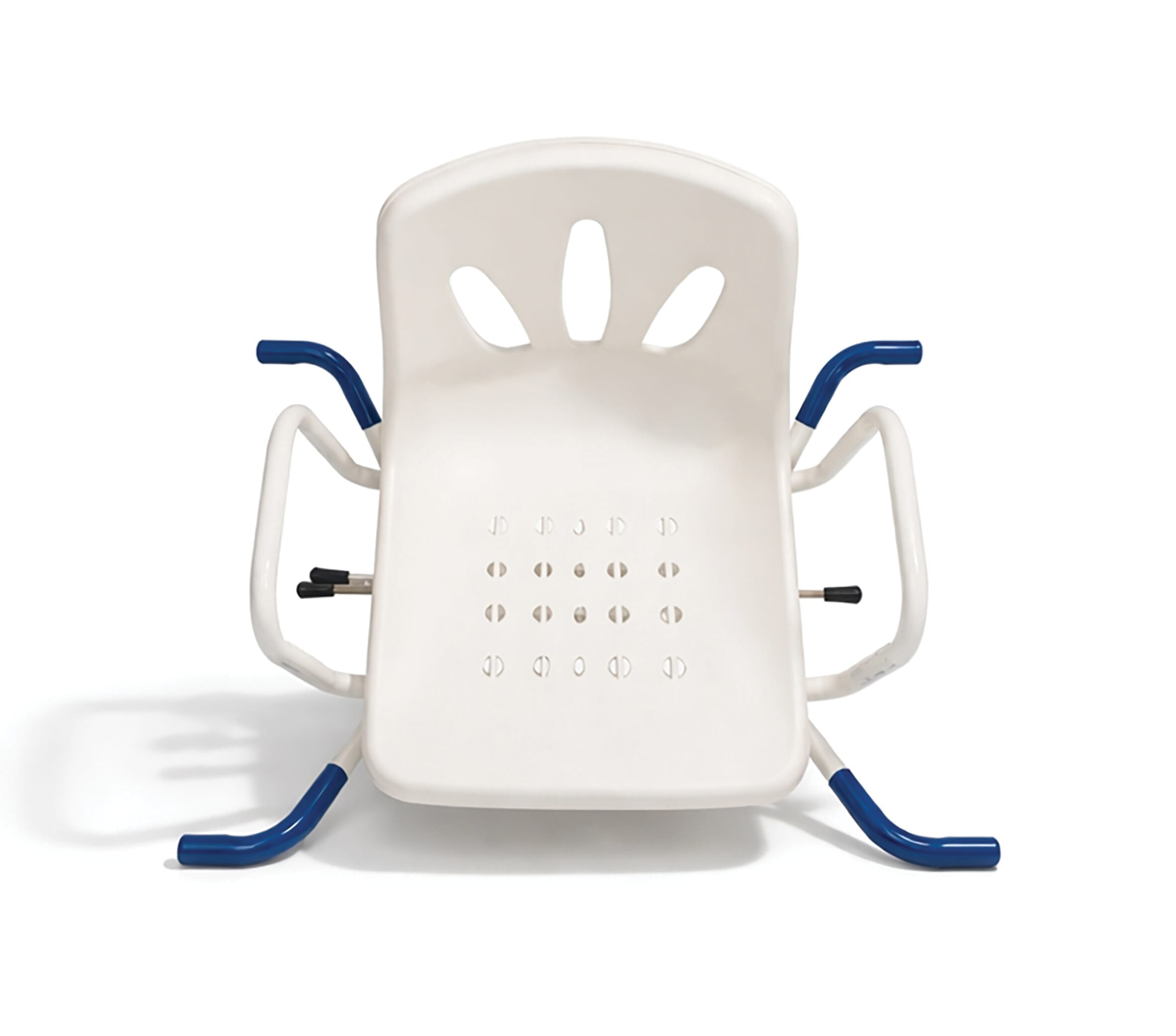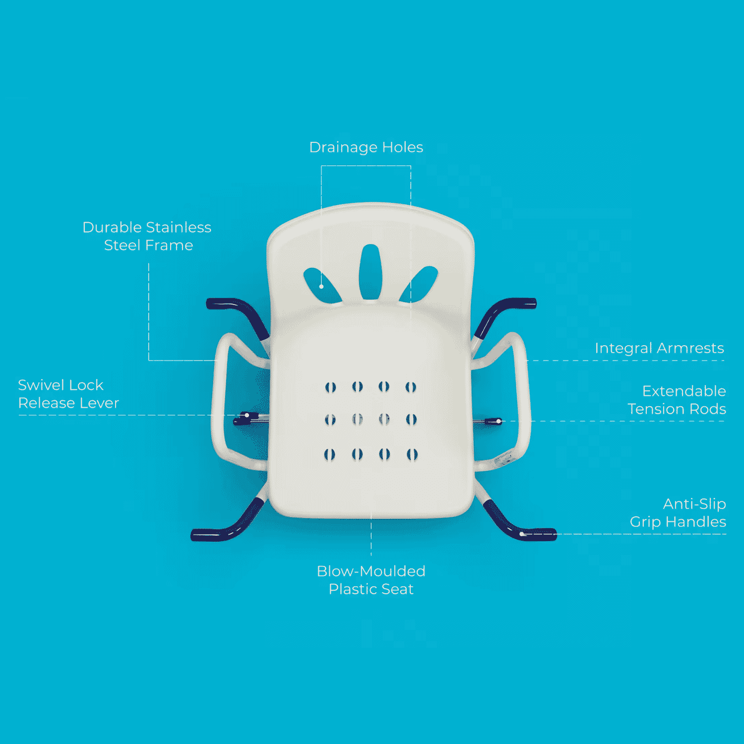 Un mécanisme de verrouillage simple maintient le siège stable pendant les transferts, tandis que les accoudoirs intégrés offrent une sécurité supplémentaire aux utilisateurs qui se sentent instables ou qui ont besoin de soutien supplémentaire. Le siège est fabriqué à partir d'un cadre en acier inoxydable durable et d'un siège en plastique moulé par soufflage avec des trous de drainage, permettant à l'eau de s'échapper rapidement et gardant la surface confortable et hygiénique.
