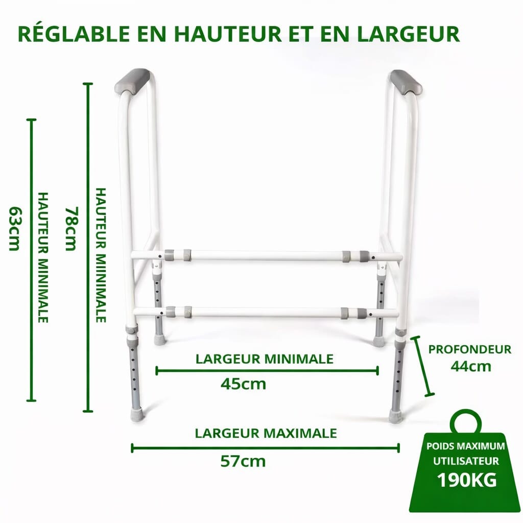 Cadre de WC économique, réglable en hauteur et en largeur, offrant un appui stable et sécurisé pour faciliter l’assise et le relevage des personnes à mobilité ou force réduite.