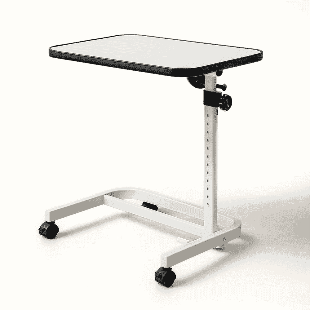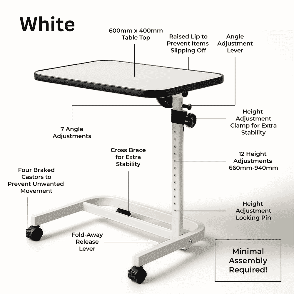 Disponible en deux finitions attrayantes – un cadre à effet martelé avec un dessus en bois foncé, ou une version entièrement blanche – cette table de fauteuil est à la fois pratique et élégante, parfaite pour une utilisation à domicile ou en milieu de soins.