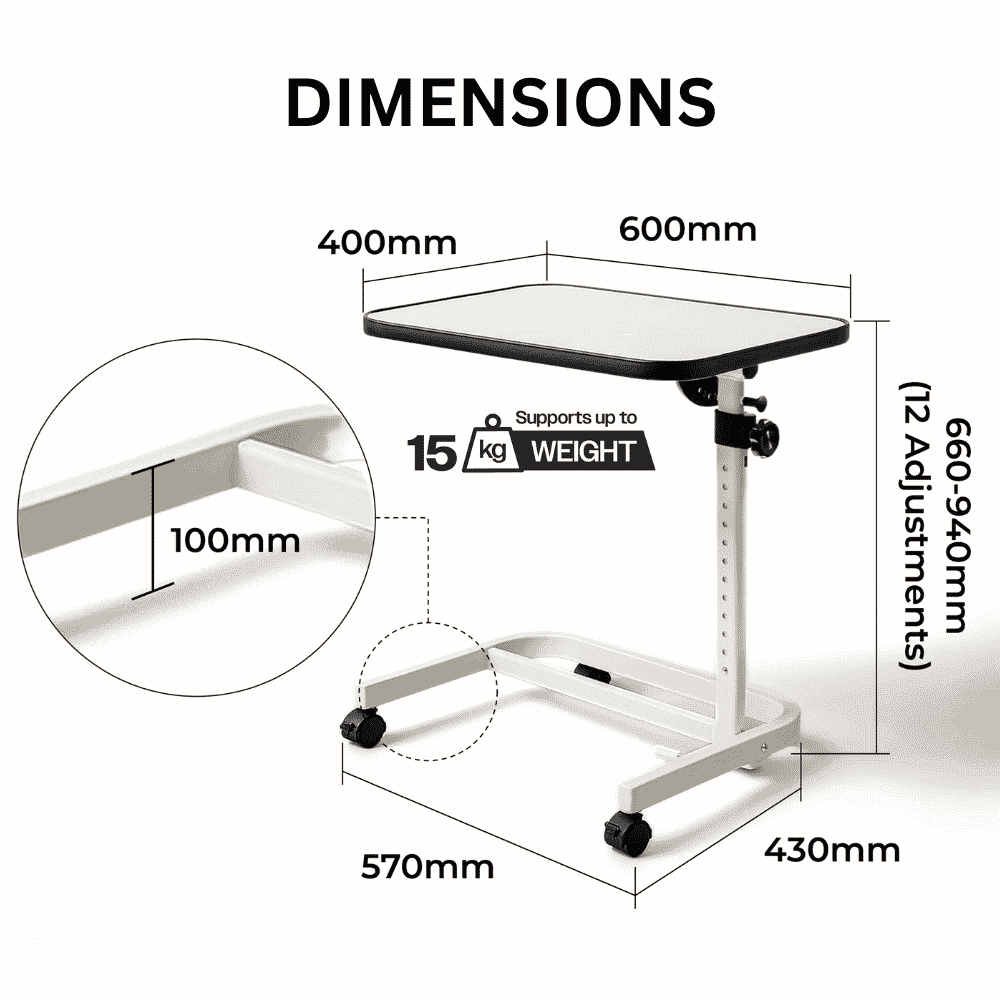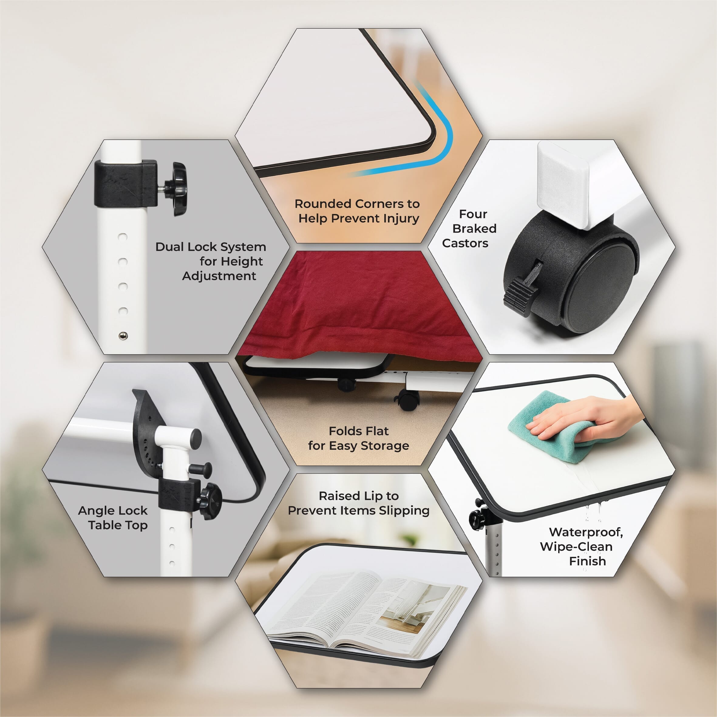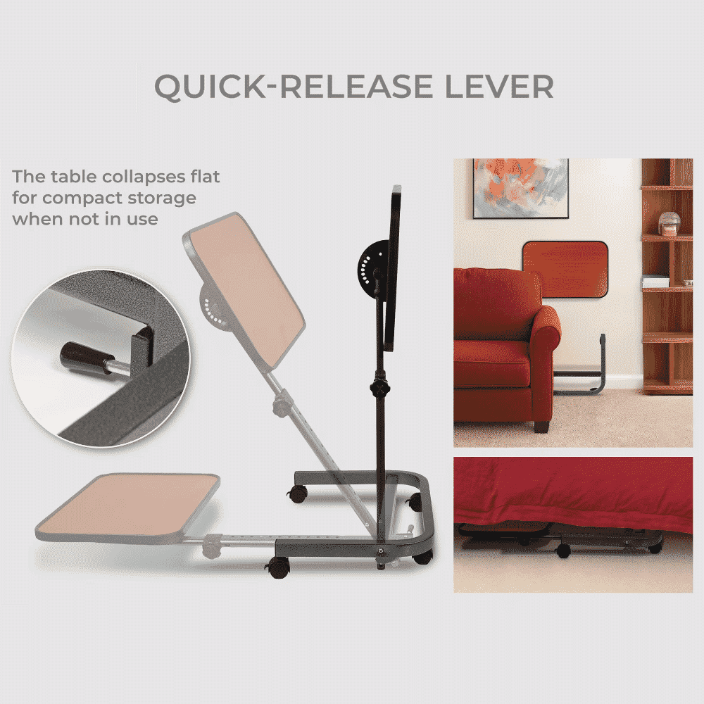 Avec un dégagement de 10 cm sous la base, la table glisse facilement sous la plupart des fauteuils et fauteuils roulants, rapprochant confortablement la surface de l'utilisateur. Elle ne pèse que 8 kg, ce qui la rend suffisamment légère pour être déplacée et rangée facilement. La surface est facile à nettoyer et un assemblage minimal est requis.