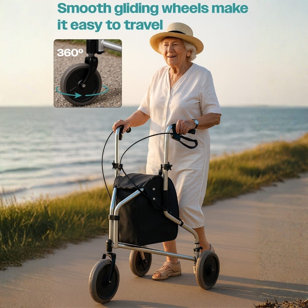 Le déambulateur trois roues est une aide à la mobilité pratique et fiable, conçue pour offrir aux utilisateurs un soutien supplémentaire et de la confiance lors de la marche. Avec un cadre en acier robuste et des pneus increvables de 20 cm, il assure un mouvement fluide et stable à la fois à l'intérieur et à l'extérieur, y compris sur des terrains irréguliers tels que des chemins de gravier ou des zones herbeuses.