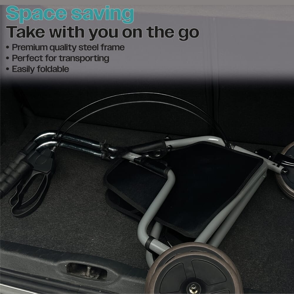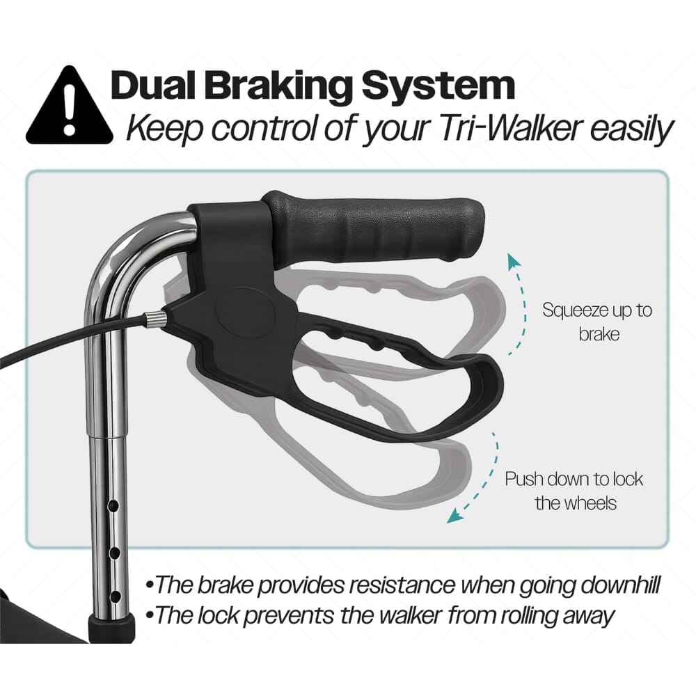 Les poignées ergonomiques le rendent confortable à utiliser pendant de longues périodes, tandis que la hauteur réglable (83–99 cm) permet d'adapter le déambulateur à différents utilisateurs. Les freins à boucle adaptés aux personnes arthritiques offrent un contrôle simple et sécurisé, permettant à l'utilisateur de ralentir ou de verrouiller le déambulateur en toute sécurité, même avec une dextérité limitée.
