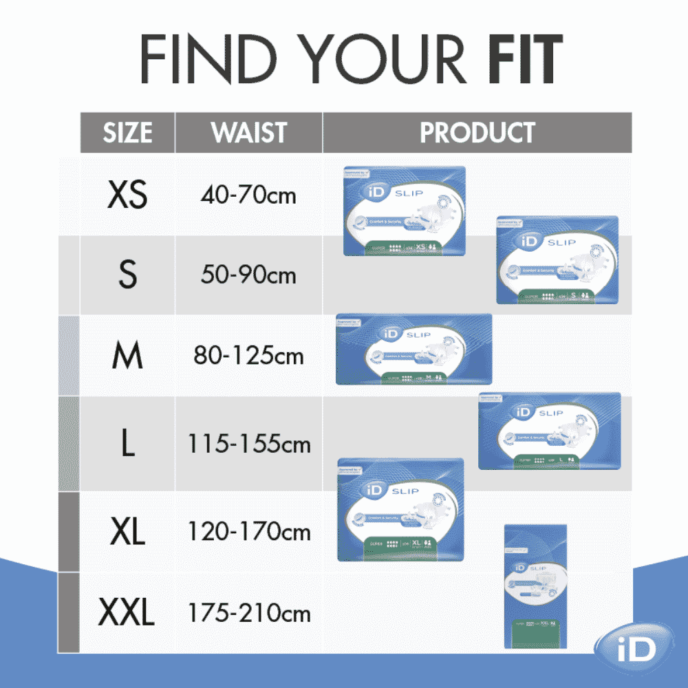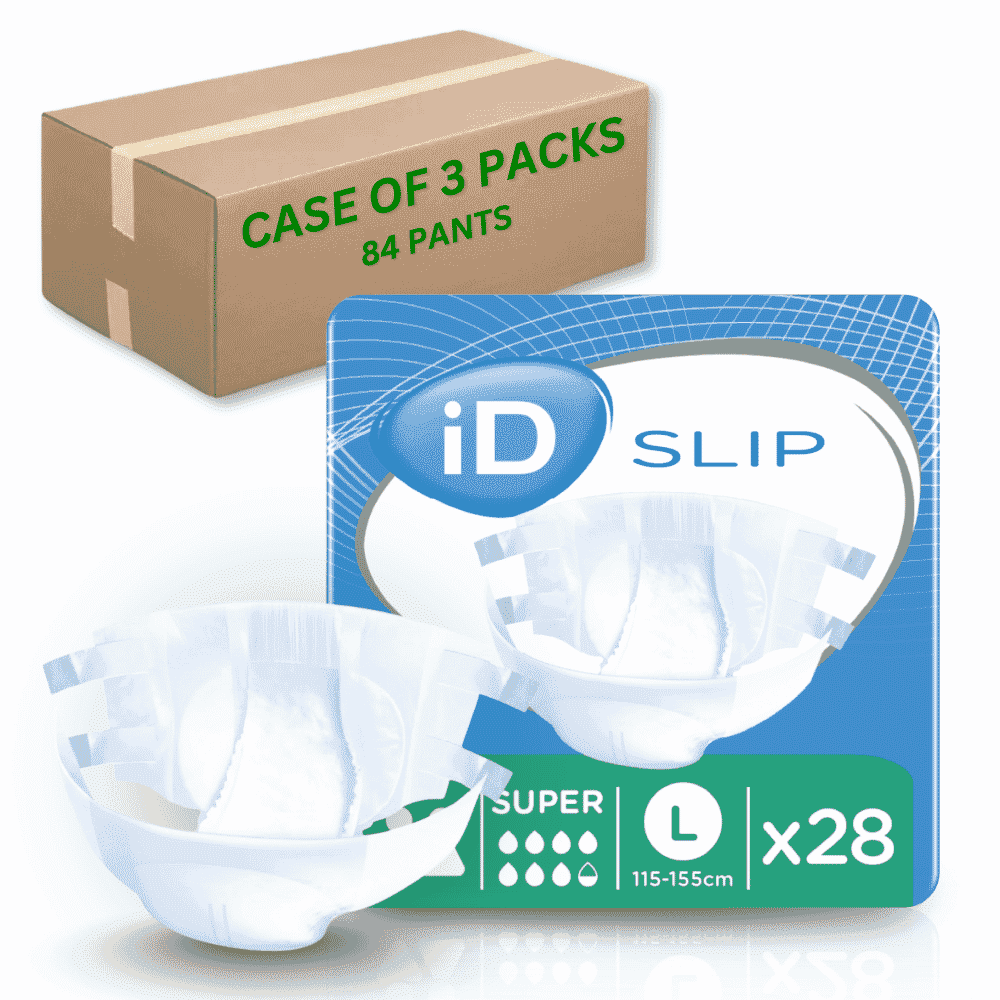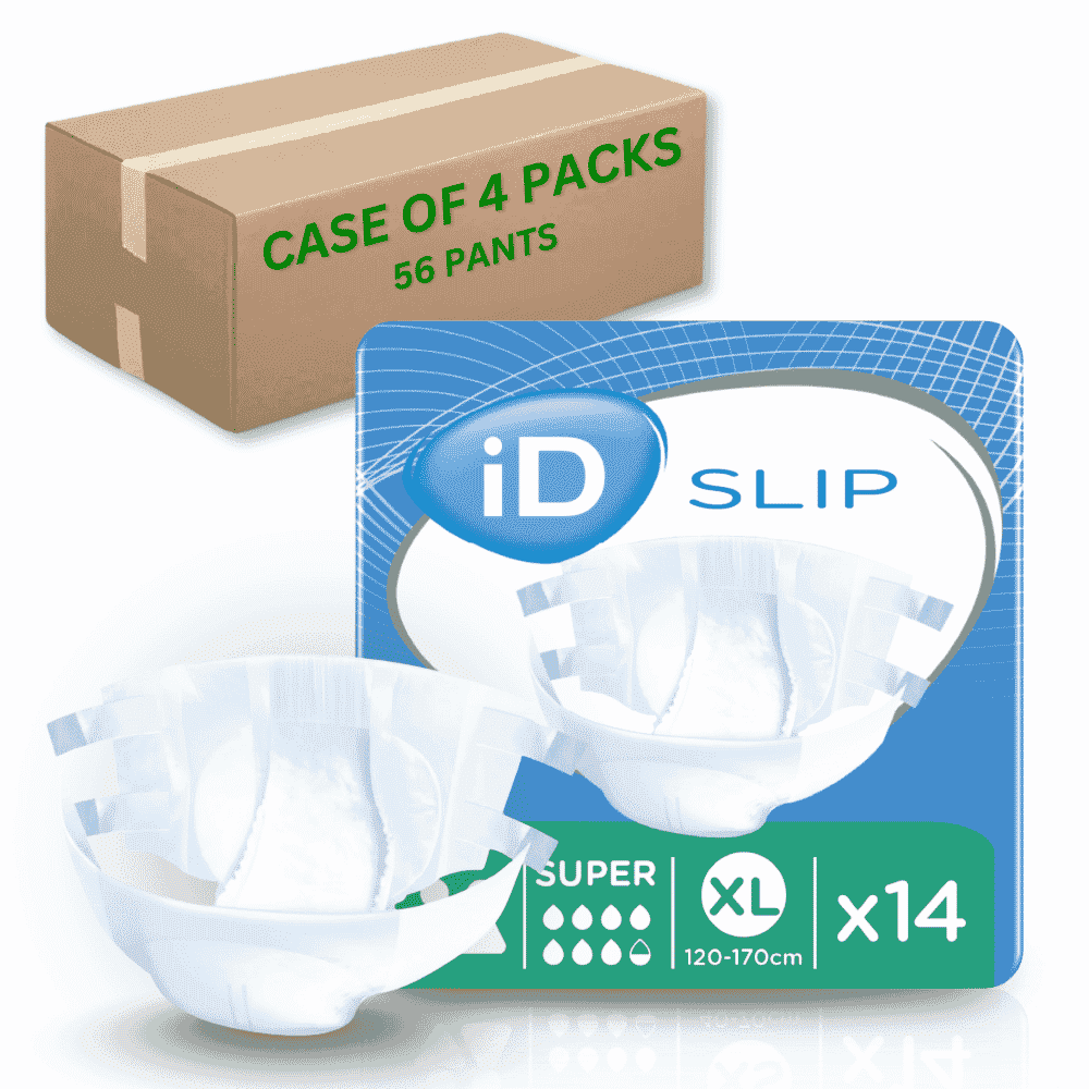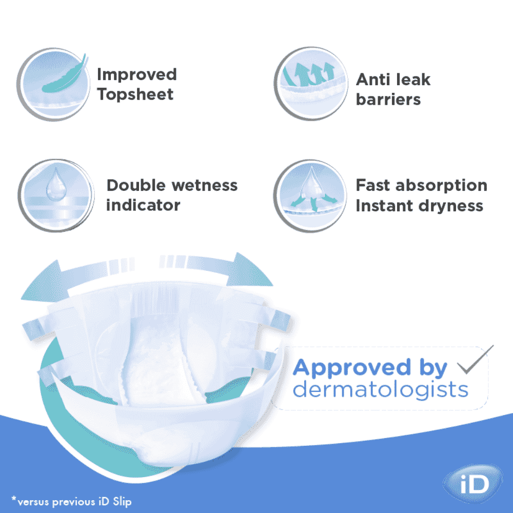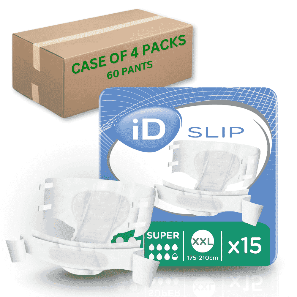 La gamme complète iD Slip est testée dermatologiquement pour minimiser le risque d'irritation de la peau. iD Slip Super est disponible en XS, Small, Medium, Large, XL et XXL, avec des options de caisses en gros pour les utilisateurs réguliers ou les environnements de soins.