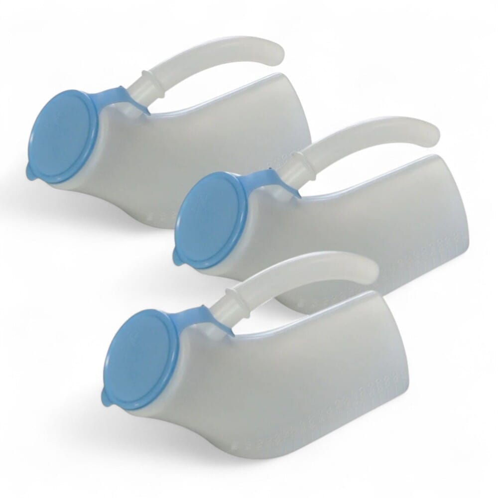 Également disponible en pack triple économique, l'urinal masculin avec couvercle est une aide simple mais essentielle pour les personnes à mobilité réduite.
