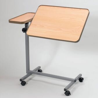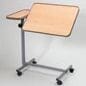 Cette table dispose de deux surfaces distinctes pour une plus grande polyvalence : un grand plateau inclinable qui peut être ajusté selon la préférence de l'utilisateur, et une section fixe plus petite pour garder les boissons, médicaments ou autres objets à niveau et en sécurité. La hauteur peut être facilement ajustée à l'aide d'une simple pince à main, permettant à la table de s'adapter confortablement à une variété de fauteuils ou de lits.