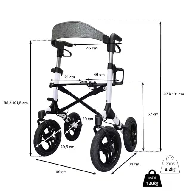 Equipé de poignées réglables en hauteur pour un ajustement optimal, de freins ergonomiques pour un arrêt en toute sécurité et d’un siège intégré pour une pause confortable lors de vos promenades, ce déambulateur répond aux besoins des personnes en quête d’autonomie renforcée.